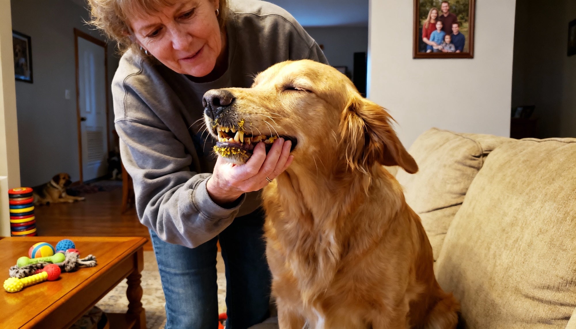 "I was scrubbing his teeth every day and that brown cement never budged. Two weeks with Dentapaw — it literally cracked off in chunks. My Golden's breath went from 'dead animal' to completely neutral. I cried when I saw his white teeth again."